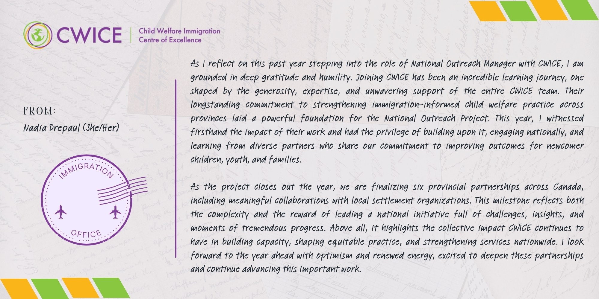 As I reflect on this past year stepping into the role of National Outreach Manager with CWICE, I am grounded in deep gratitude and humility. Joining CWICE has been an incredible learning journey, one shaped by the generosity, expertise, and unwavering support of the entire CWICE team. Their longstanding commitment to strengthening immigration-informed child welfare practice across provinces laid a powerful foundation for the National Outreach Project. This year, I witnessed firsthand the impact of their work and had the privilege of building upon it, engaging nationally, and learning from diverse partners who share our commitment to improving outcomes for newcomer children, youth, and families.